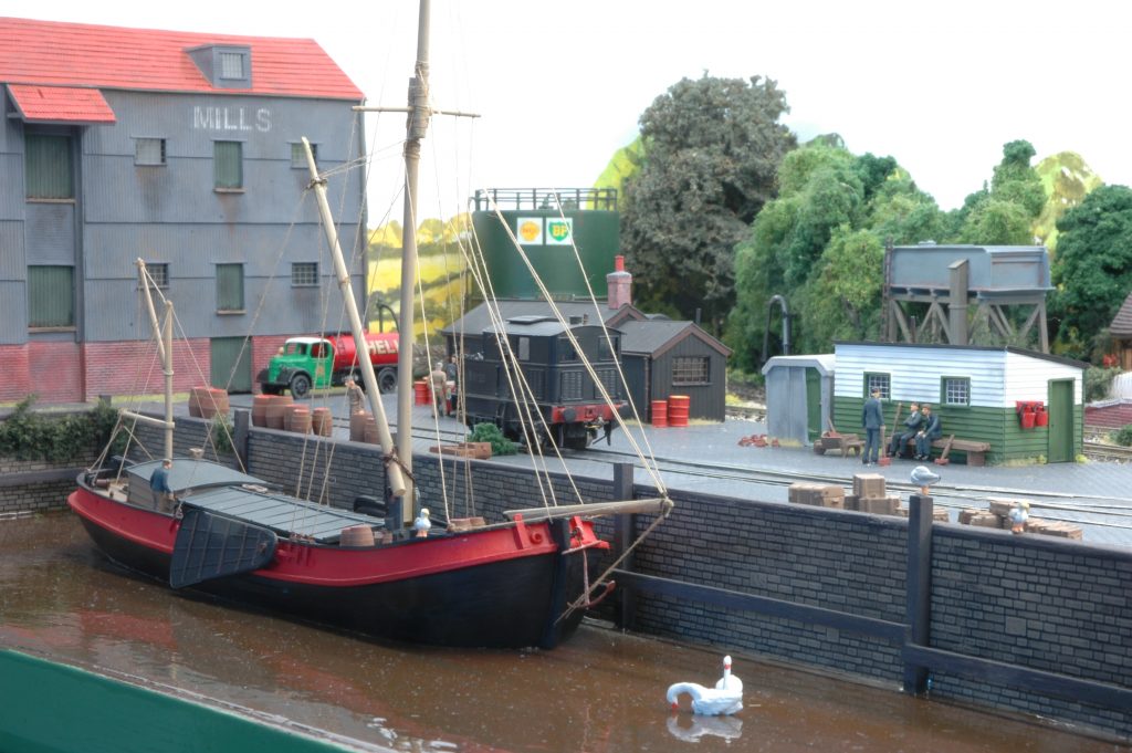 The trains from the main line enter Heybridge Wharf via the line between the Church and the gas works. This is the end of the line for the stock not allowed to proceed along the tramway to Heybridge Town. Those that are allowed will run round their train and proceed along the tramway squeezed between the gasworks and Colly Tobbold’s brewery. The wharf still receives one of the last barges still trading but now converted with a diesel engine.