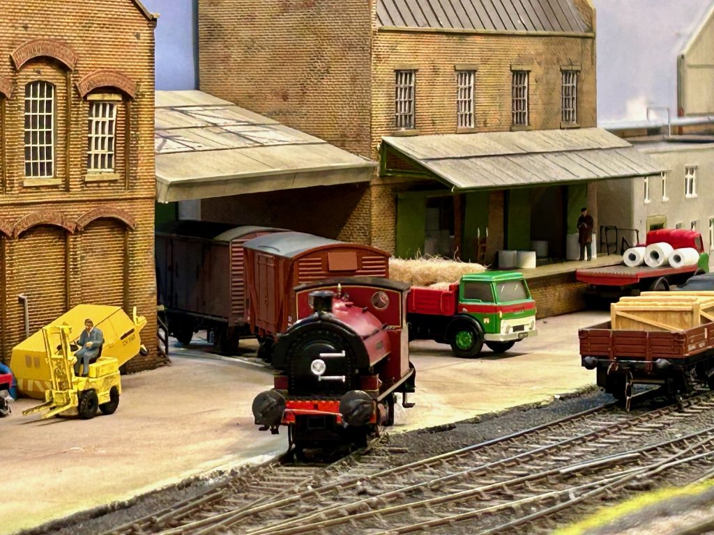 Track is hand-built using Exactoscale and C&L components. The layout is wired for conventional, analogue control. Pint control uses Tortoise motors. The layout is also fitted with the Faller car system, allowing road vehicles to pass through the factory.