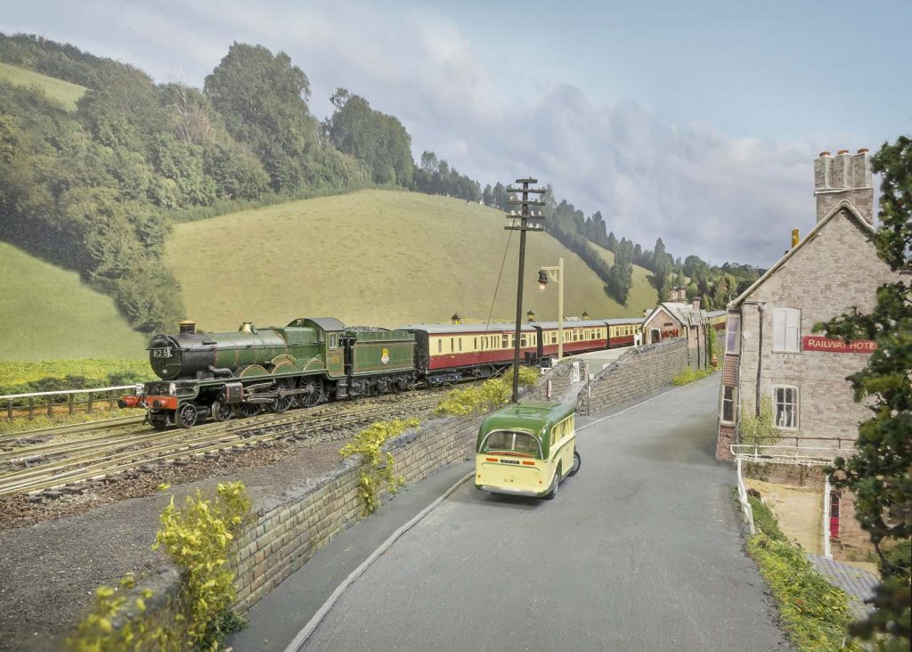 All the buildings are scratch-built, many from printouts of photos of the current buildings. The station building, designed by Brunel, was unique due to the narrow space. Next to the tunnel is the large brewery, built by the railway company to replace existing breweries whose water supply the tunnel cut through. At the period modelled it had become a cider factory, which later closed but has now reopened as the Wickwar Brewing Company. The backscene was ‘Photoshopped’ from photographs of the real location and printed on vinyl.